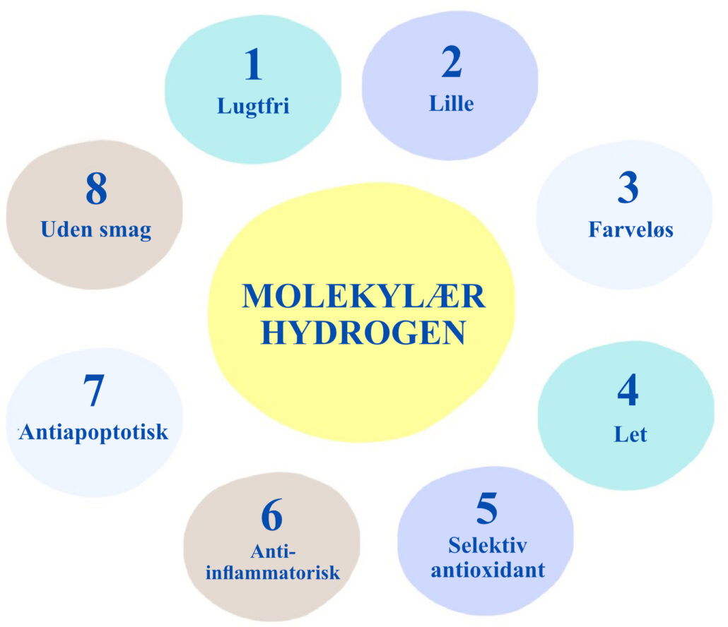 H2 er det mindste kendte molekyle med en gasegenskab ved standard tryk- og temperaturforhold og en massefylde på 0,089 g/l [20]. H2 henviser til hydrogengas, som er en farveløs, lugtfri, smagløs, ikke-toksisk og ikke-metallisk gas. Den har en relativt lav opløselighed i vand med en koncentration på 0,8 mmol pr. liter (1,6 mg/l eller 1,6 vægtdele pr. million) under standardbetingelser. Den har en høj diffusionshastighed, ledningsevne og varmefylde [21]. H2 kan brænde ved koncentrationer mellem 4 og 75 % i luft og forårsage en eksplosion mellem 18,3 og 59 % (v/v). Fortynding af H2 med nitrogen (N2) kan sænke disse niveauer [22-24]. Med hensyn til biologiske egenskaber er H2 en selektiv antioxidant. Det kan reducere hydroxylradikaler og i mindre grad peroxynitrit, hvilket beskytter cellerne mod oxidative reaktioner [7]. Studier viser, at H2 reducerer oxidativ stress og forbedrer det cellulære antioxidantsystem [25]. Desuden øger det aktiviteten og ekspressionen af cellulære antioxidantenzymer [26,27]. Det kan også regulere apoptose-relaterede faktorer, reducere apoptose og neurale skader og reducere mængden af inflammatoriske cytokiner og immunocytstimulering [28, 29].