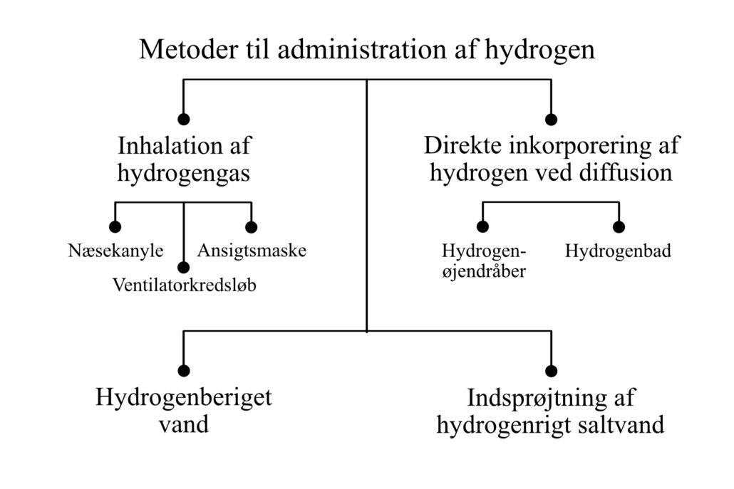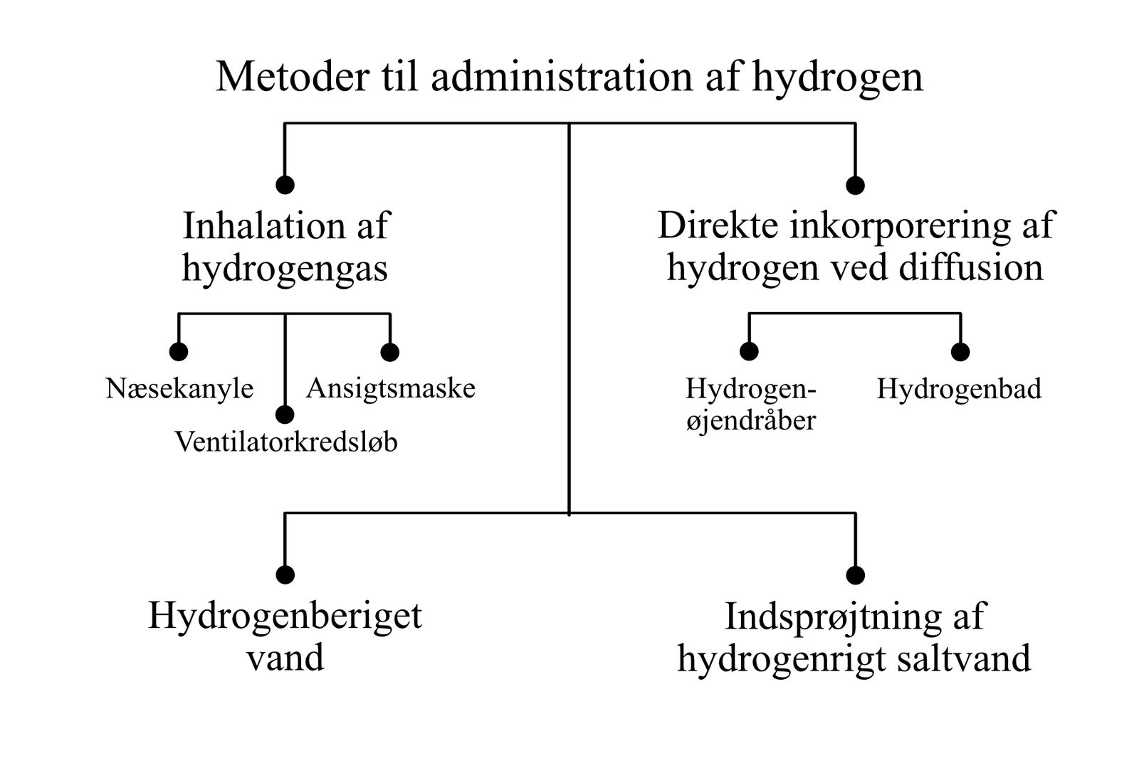 Der er forskellige metoder til at administrere H2, herunder inhalation, drikke hydrogenrigt vand (HRW), injektion af hydrogenrigt saltvand (HRS), tage et hydrogenbad og bruge hydrogenrige øjendråber (fig. 2) [32].