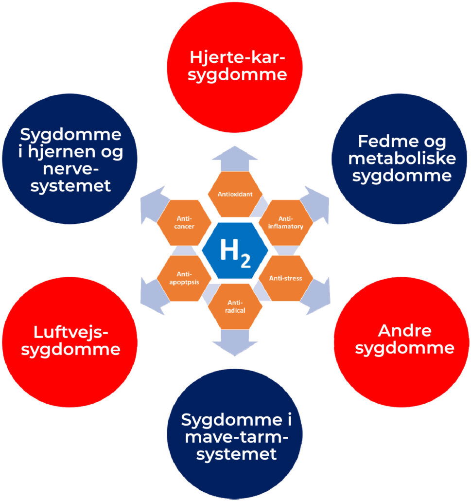 Hydrogenernæringsterapi er et nyt område med et lovende potentiale som et naturligt og miljøvenligt behandlingsalternativ til kemiske behandlinger og strålebehandlinger. Administration af H2 kan hjælpe med at forebygge og lindre en lang række sygdomme, herunder kardiovaskulære, respiratoriske og metaboliske sygdomme, fedme, gastrointestinale problemer samt sygdomme i hjernen og nervesystemet (fig. 3).