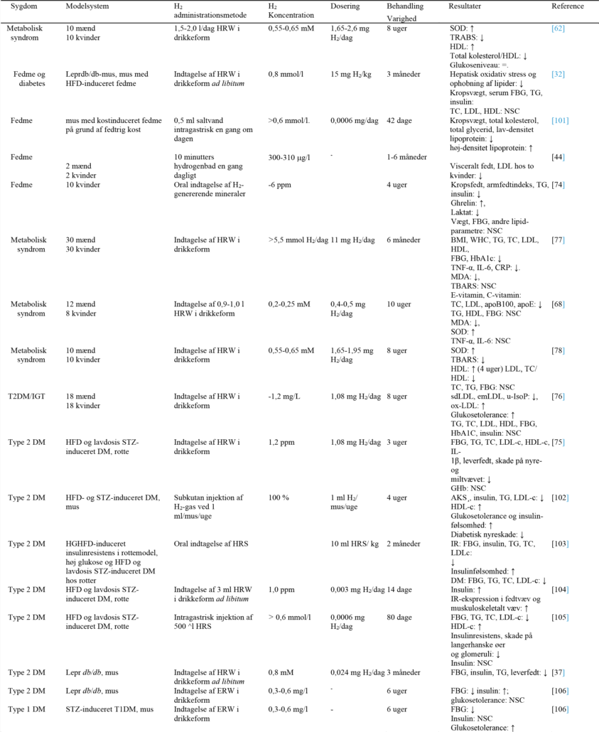 streptozotocin; FBG, fasteblodsukker; TG, total triglycerid; TC, total kolesterol; LDL-c, lav densitet-lipoproteinkolesterol; HDL-c, høj densitet-lipoproteinkolesterol; IL-1β, interleukin-1 beta; GHb, glyceret hæmoglobin; HGHFD, diæt med højt glukoseindhold og højt fedtindhold; IR, insulinresistens; IRs, insulinreceptorer; Lepr db/db, db/ db med leptinreceptormangel; HRW, hydrogenrigt vand; HRS, hydrogenrigt saltvand; ERW, elektrolyseret reduceret vand; IGT, nedsat glukosetolerance; sdLDL, small dense LDL-molekyler; emLDL, elektronegativ ladning af modificeret LDL; u-IsoP, 8-isoprostan i urin; oxLDL, oxideret LDL; HbA1C, hæmoglobin A1c; TBARS, thiobarbitursyre-reaktive stoffer; apoB100, apolipoprotein B100; apoE, apolipoprotein E; TNF-α, tumornekrosefaktor alfa; IL-6, interleukin-6; BMI, body mass index; WHC, talje/hoftemål; CRP, C-reaktivt protein; MDA, malondialdehyd; ALP, alkalisk fosfatase; BA, arteria brachialis; ⇓, insignifikant fald; ⇑, insignifikant stigning; NSC, ingen signifikant ændring; No, ikke tilgængelig [107].
