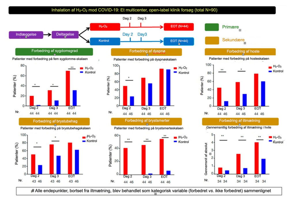 Figur 4. Overblik over og resultater fra vellykket COVID-19-studie med positive parametre for alle endepunkter efter inhalation af H2-O2 sammenlignet med kontrolgruppen. * p < 0,05, ** p < 0,01, EOT = endt behandling (end-of-treatment). Gengivet med tilladelse fra [55], Journal of Thoracic Disease, offentliggjort af AME Publishing Company, Hong Kong, 2020.