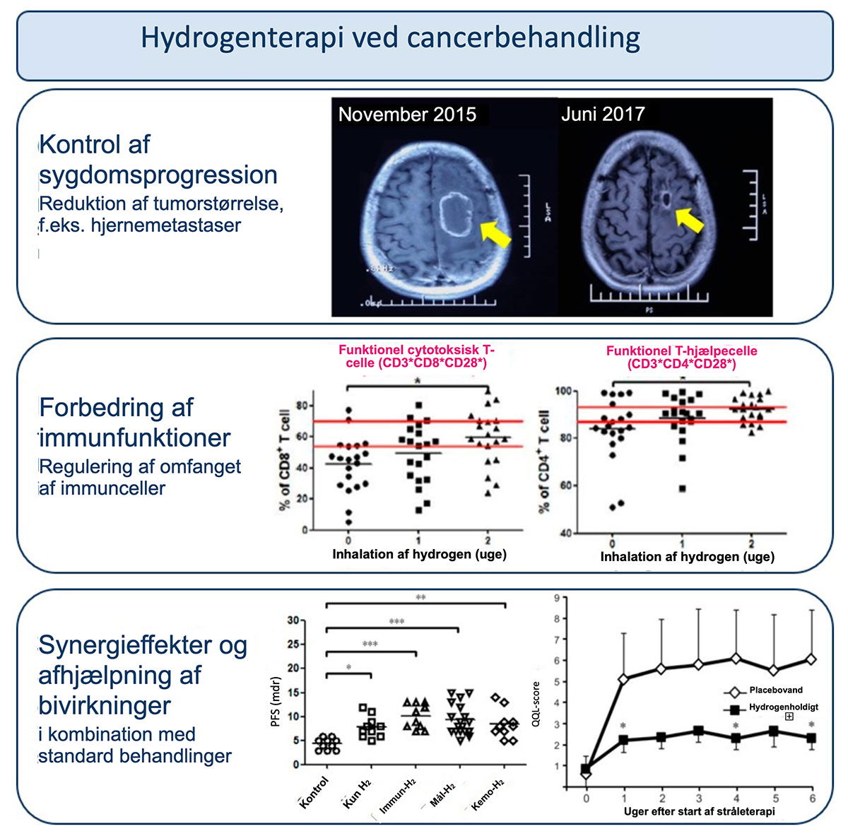 To særskilte casestudier med cancerpatienter med flere metastaser har vist utroligt stor effekt af behandling med inhalation af H2. En af patienter led også af galdeblærekarcinom og var i daglig behandling med inhalation af H2. I den første måned fortsatte tumorerne med at vokse efterfulgt af en gradvis reduktion i tumorstørrelse og tumormarkørerniveauer, som til sidst igen var normale. Efter ca. 2,5 måned kunne patienten genoptage sit normale liv og var fortsat i live efter 10 måneder. Der blev observeret pseudoprogressiv remission efter H2-terapi, hvilket kan minde om det mønster, der forekommer efter behandling med behandling med PD-1-antistoffer. Det tyder på, at H2 kan påvirke immunsystemet [22,23]. Den anden case omhandlede en patient med ikke-småcellet lungekræft, der gennemgik en monoterapi med inhalation af H2, efter orale og kirurgiske behandlinger havde stabiliseret de første læsioner. Efter fire måneders H2-behandling var hjernemetastaserne blevet mindre, og de var helt forsvundet efter et år. Lever- og lungemetastaserne var også stabiliseret efter et år, og overlevelsen var længere [24]. Disse casestudier er imponerende observationer og viser, at H2 eventuelt kan give en signifikant kontrol over tumorer, når standard cancerbehandlinger er slået fejl. Det er dog ikke empirisk dokumentation for, at H2 har en medicinsk virkning hos cancerpatienter. Til det formål er der brug for et statistisk grundlag fra systemiske kliniske forsøg.