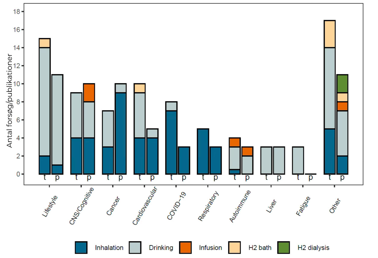Fig. 2. Registrerede kliniske forsøg (t) og videnskabelige publikationer(p) vedrørende hydrogenterapi, sorteret ud fra indikation og administrationsmetode.